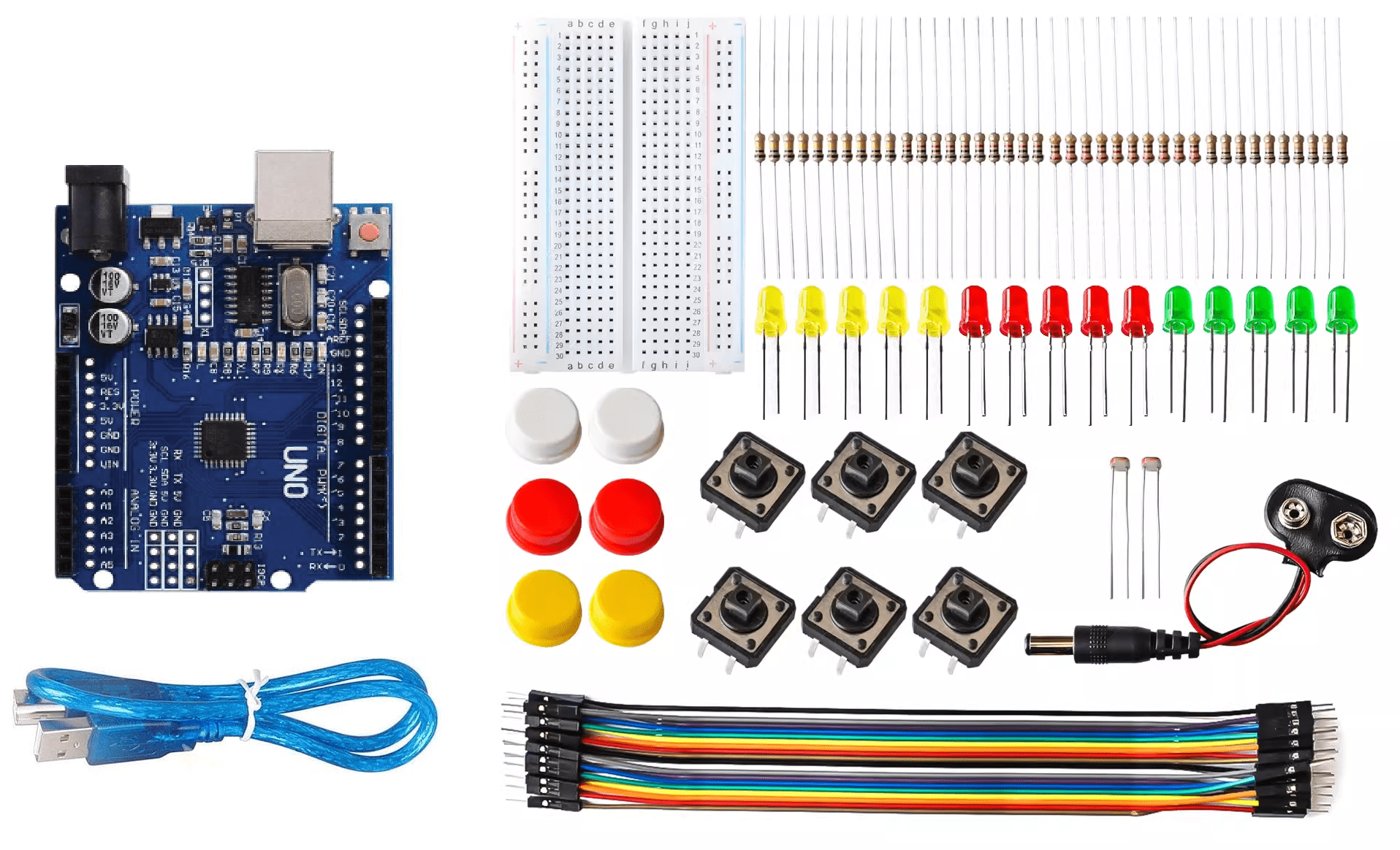 ნაკრების შემადგენლობაშია: სამაკეტო დაფა, 6 ცალი 3 ფერის ღილაკი, 5 წითელი 5 ყვითელი და 5 მწვანე ლედ ნათურა,20 ჯამფერ კაბელი(male to male), კვების კაბელი არდუინოსთვის,ფოტორეზისტორი 1, 4 სხვადასხვა ნომინალის რეზისტორი. ორიგინალი არდუინო usb კაბელი.